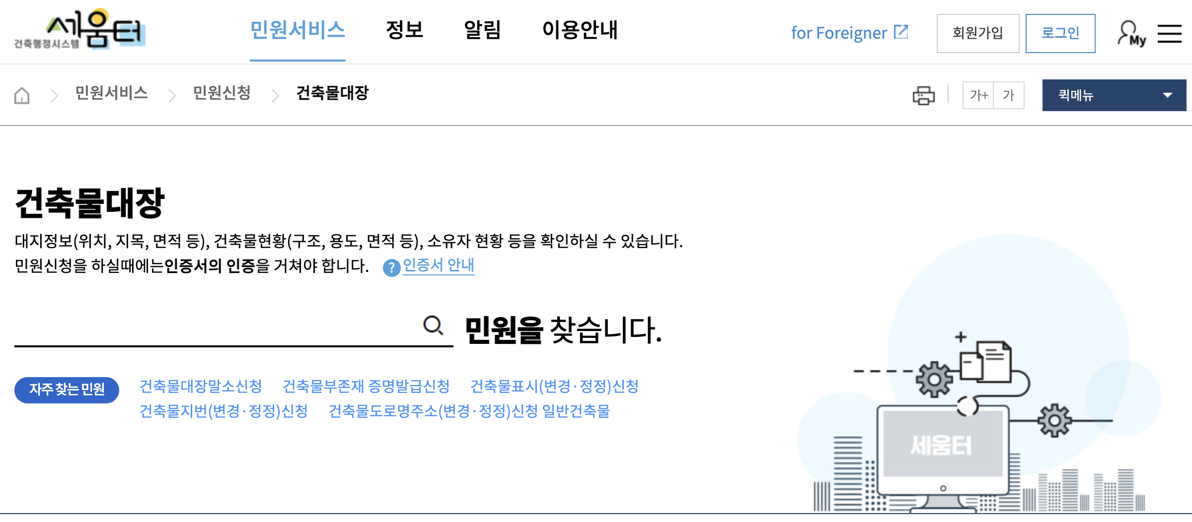 세움터는 국토교통부가 운영하는 건축 행정 전문 포털입니다.