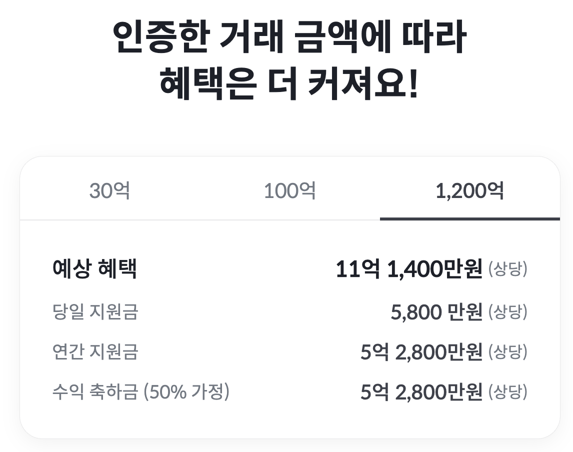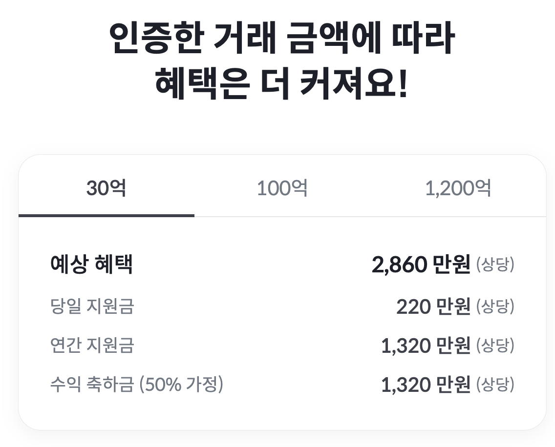 - 신규 혜택: 빗썸은 월 평균 100억 원 이상 거래한 고객 중,