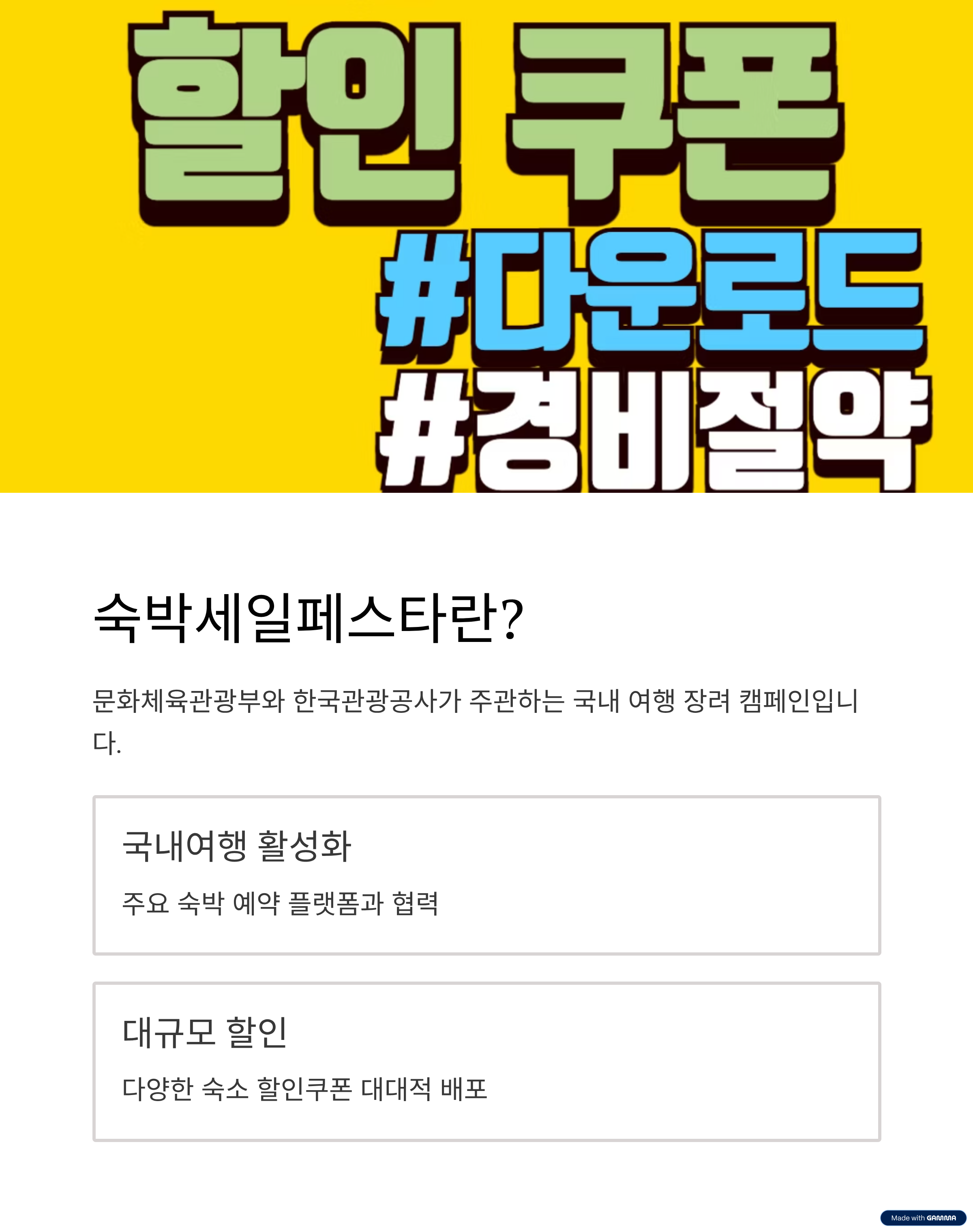 ‘숙박세일페스타’는 문화체육관광부와 한국관광공사가 주관하는 국내 여행 장려 캠페인입니다. 주요 숙박 예약 플랫폼(네이버, 야놀자, 여기어때, 인터파크 등)과 협력해 숙소 할인쿠폰을 대대적으로 배포하며, 국내 여행 활성화를 도모합니다.