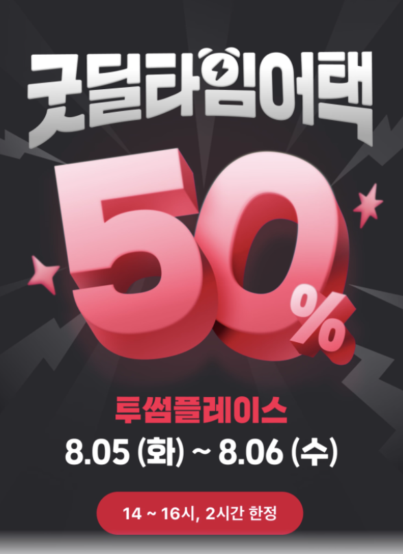 투썸플레이스에서 전품목 50% 할인 혜택! 2025년 8월 5일(화)~6일(수) 단 이틀, 오후 2시부터 4시까지 진행되는 굿딜 타임어택 프로모션. 결제 방법, 유의사항, 적용 매장까지 완벽 정리!