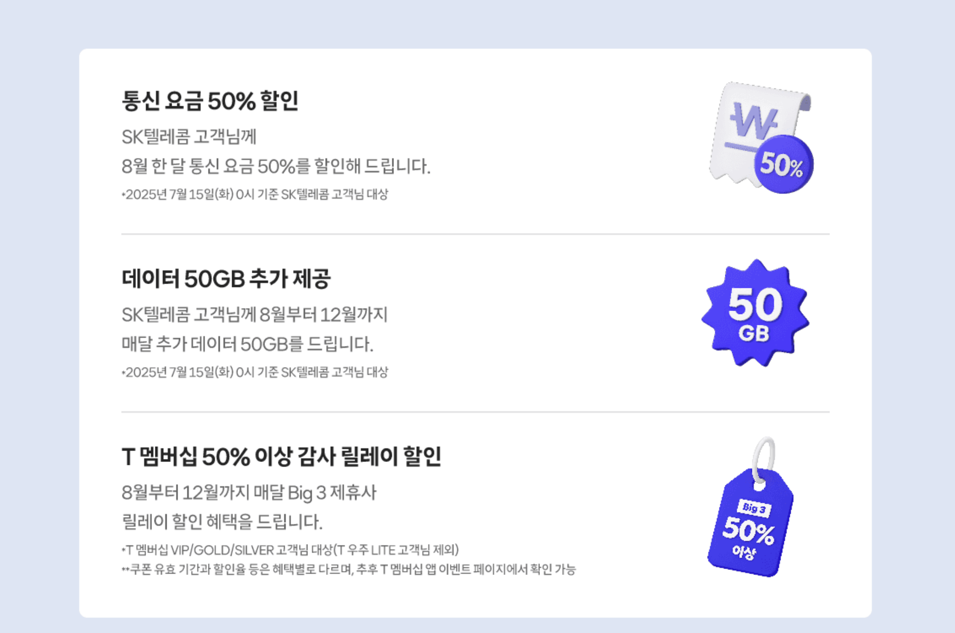 | 8월 통신요금 50% 할인 | SKT·알뜰폰 전 고객 | 신청 불필요, 8월 청구서 자동 반영 | 2025년 8월 |