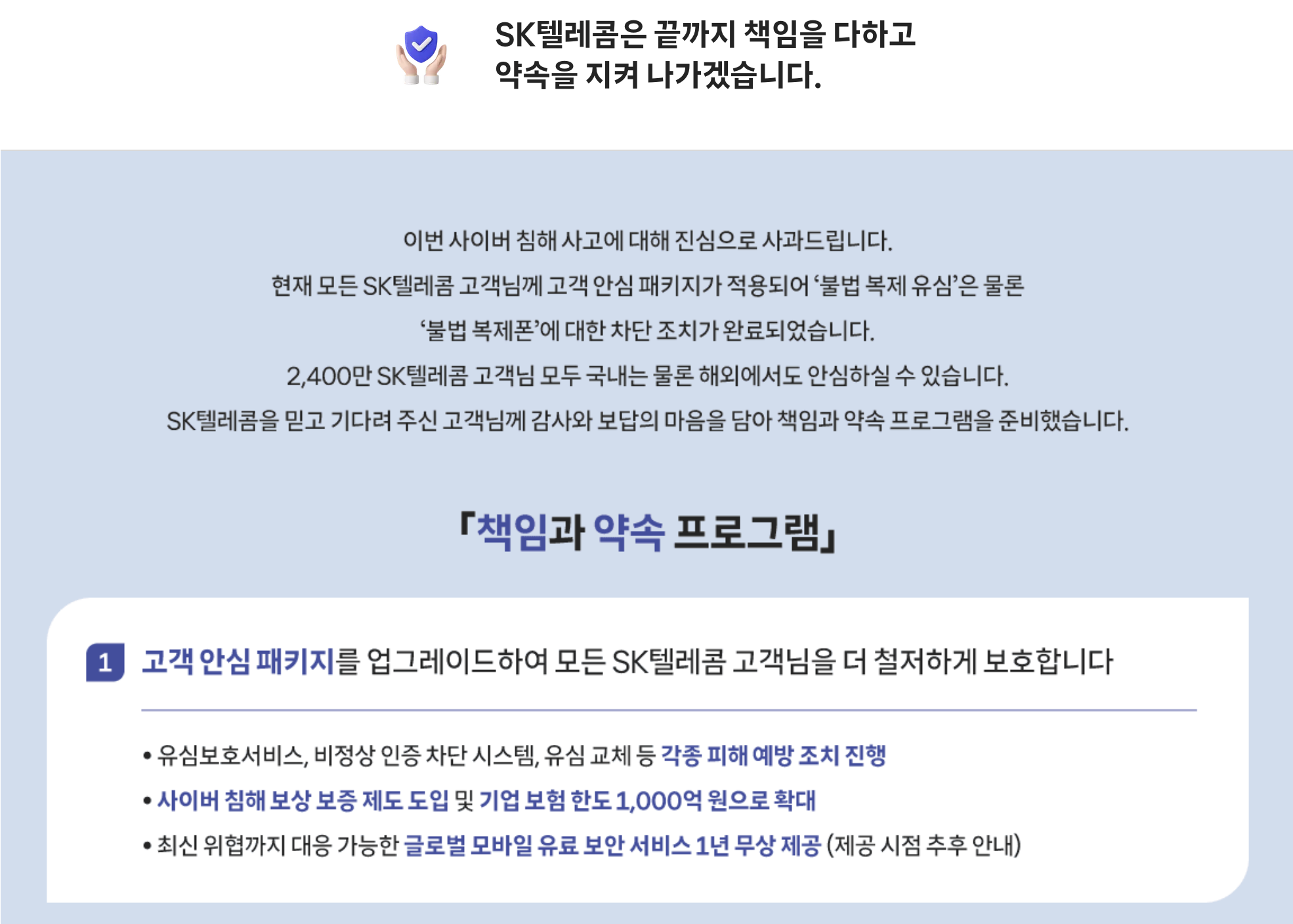 이 사고로 인해 일부 고객은 SKT를 해지하거나, 통신사 변경을 고려하게 되었고, SKT는 이에 대한 책임을 인정하고 ‘책임과 약속’ 프로그램을 발표하게 된 것입니다.